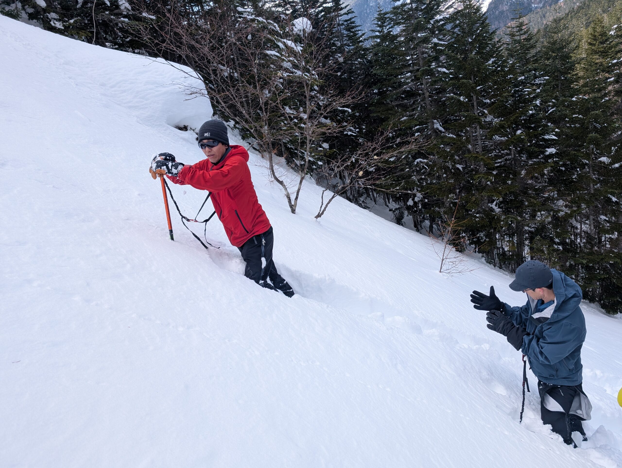 赤岳鉱泉到着後、小屋近くの急斜面に移動してピッケル使い方、アイゼンワーク講習を実施しました。