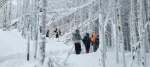 雪がしんしんと降る樹林帯は静かで穏やか。雪化粧した草木やガイドの高木さんのお話をききながらゆっくり進みます。