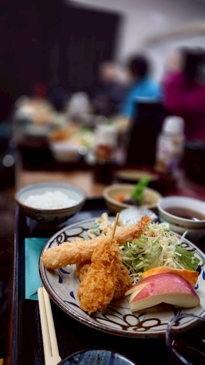 夕食はエビフライや揚げ物に山菜、煮物などバラエティーに富んだメニューで、とても豪華!デザートや、なんとワインもついていて大満足です。