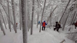 一日目は北八ヶ岳ロープウェイを使い、スノーシューを装着、そこから樹林帯をしばらく歩きます。