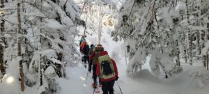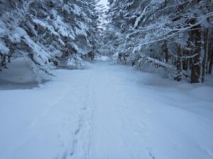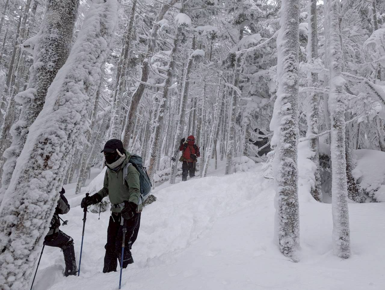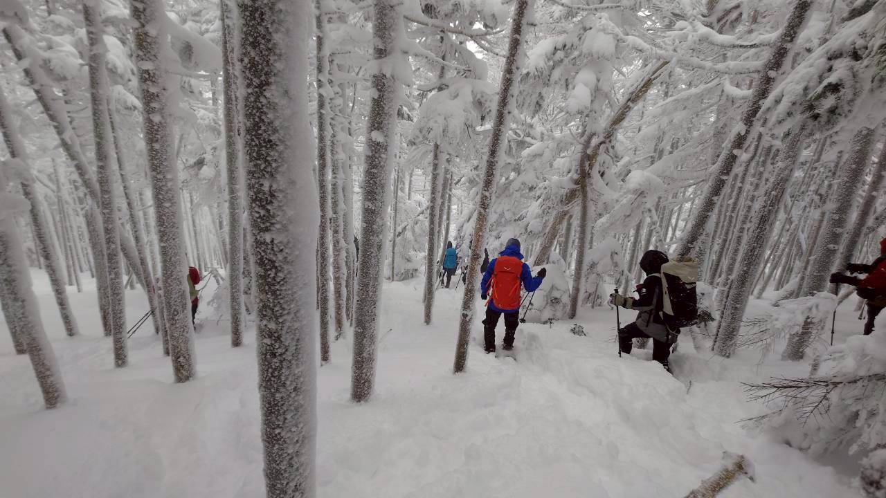 今年は積雪量が少なくて多少の不安があったものの、ちょうど到来した寒波の影響により二日目の山行は新雪ノートレースの樹林帯を踏み鳴らしながら降りていくという