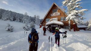 スノーシューをつけたまま歩行者天国のなだらかな傾斜を登っていくと麦草ヒュッテへ到着