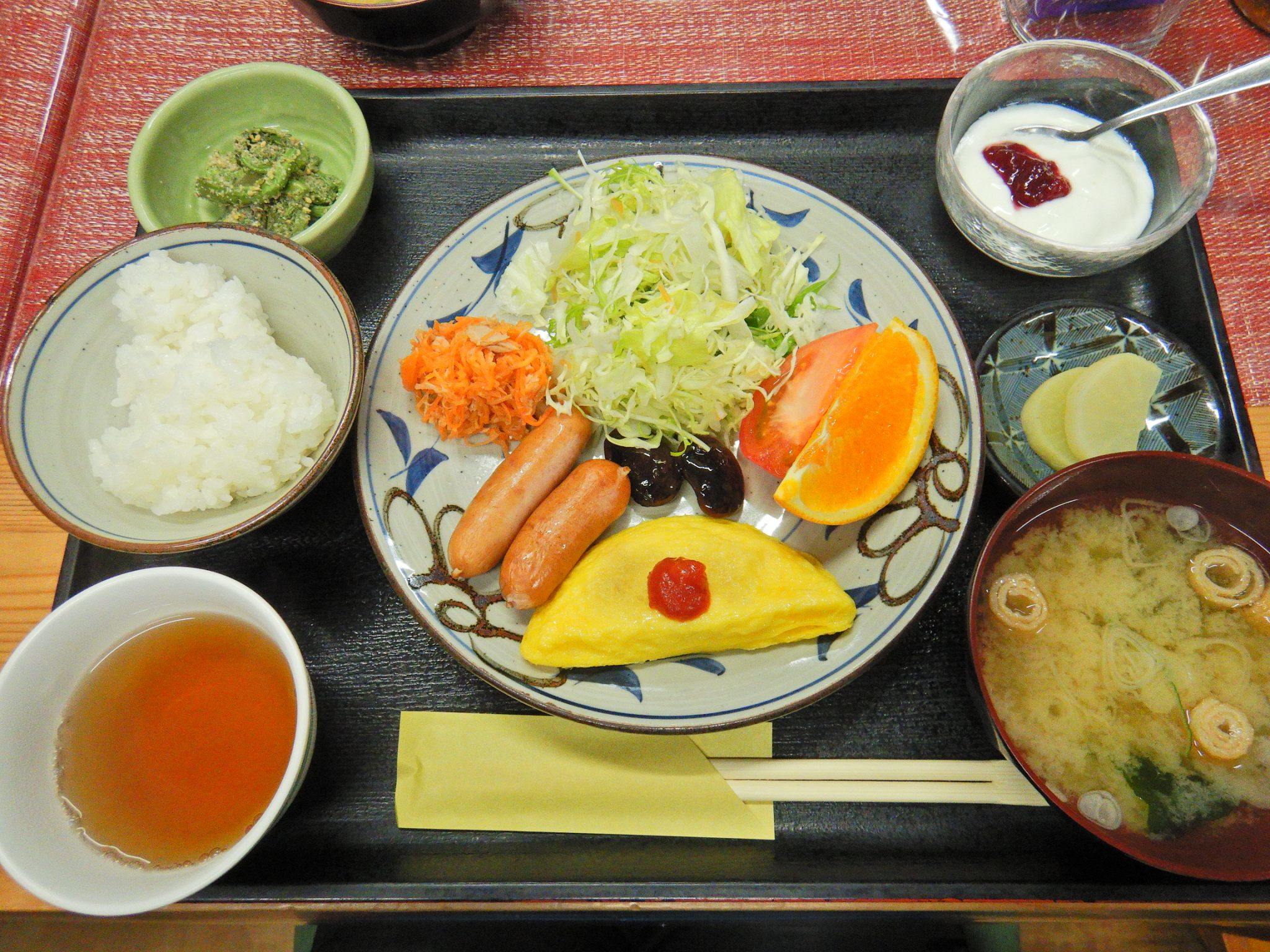 メニューはオムレツに、ウィンナーや山菜のこごめの胡麻和え、みそ汁に大きなフルーツなど朝からしっかりと栄養補給!茶臼岳と縞枯山に備えます。